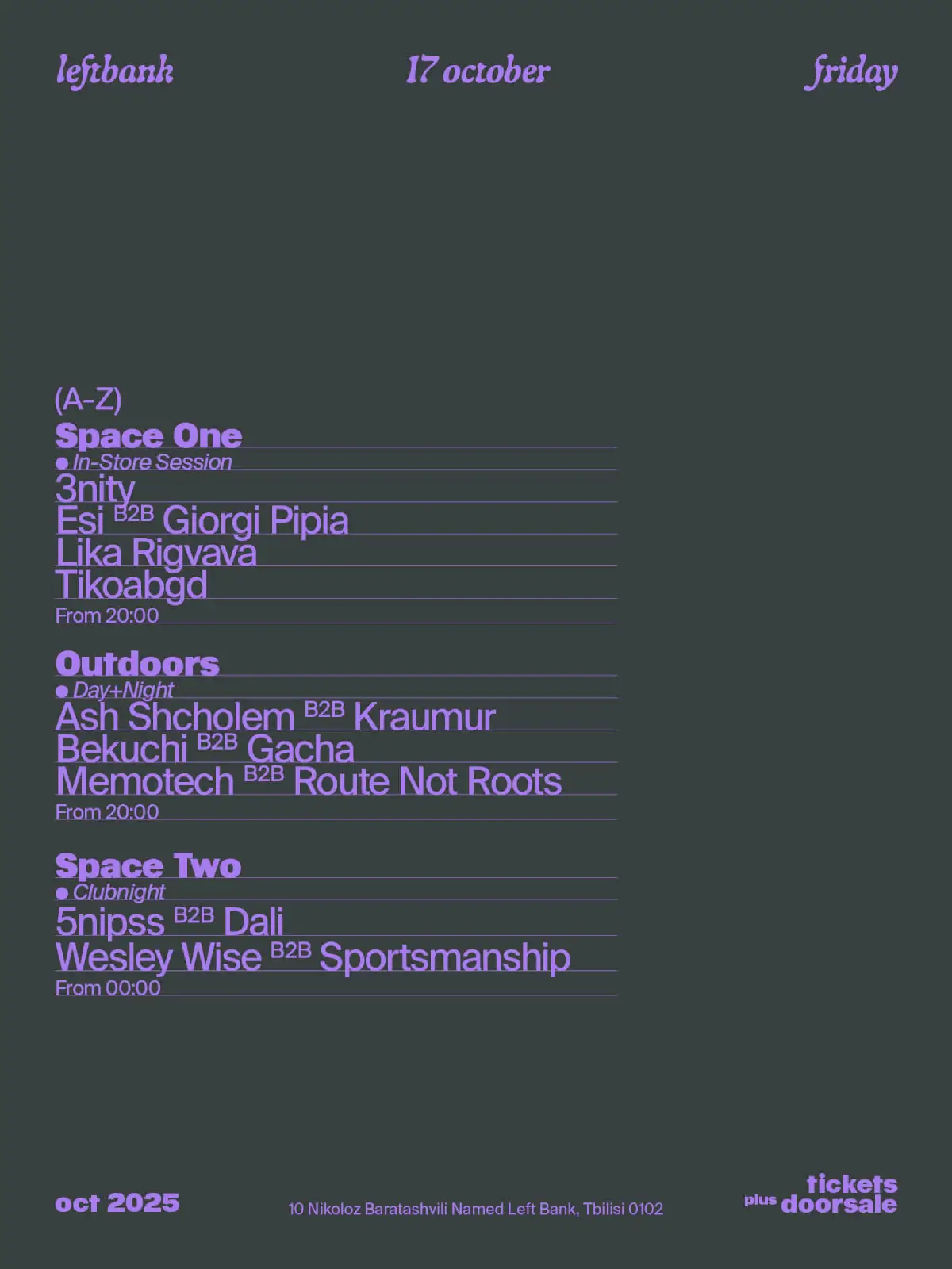 Friday, October 17, marks four years of Left Bank, a milestone celebrated with residents, crew members, and invited guests performing across all stages throughout the night. Space One opens with Esi and Giorgi Pipia sharing a back-to-back that mirrors their connection as residents, followed by crew members Tikoabgd, Lika Rigvava, and 3nity shaping the build-up before the transition to Outdoors and Space Two. Outdoors begins early with Ash Scholem and Kraumur setting an intuitive flow, followed by Memotech and Routes Not Roots whose shared residency shapes deep, evolving energy. Bekuchi joins Gacha, blending experience and technical precision in a set grounded in their long-standing collaboration. Inside Space Two, Wesley Wise and Sportsmanship extend the momentum with their layered selections, while Dali and 5nipss steer the celebration toward its finale through forward-thinking exchanges between sound and emotion.