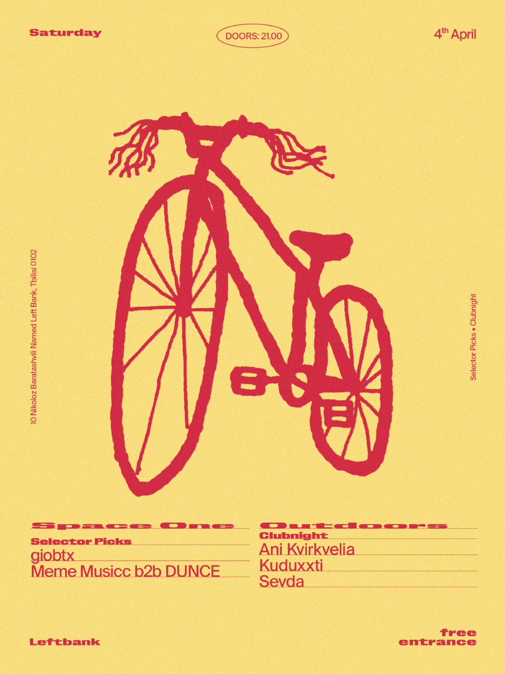 April 4 brings another Free Saturdays to Left Bank, with Space One setting the tone ahead of Outdoors before midnight shifts focus. Each artist on the outdoor program arrived at the booth through a different route. Ani Kvirkvelia built her practice through Mutant Radio hosting and a six-month residency at Germany's EOS Radio, performances at Bassiani/Horoom and Tresor adding international weight to a locally rooted sensibility. Sevda, the project of KHIDI resident Ladouka Ninua, draws on production work across Oimaccta and OTHR for sets grounded in technical depth. Munich-based Kuduxxti reads the room through a different lens, his dub-inflected approach to hypnotic techno shaped by years in artist care and light-jockey work.