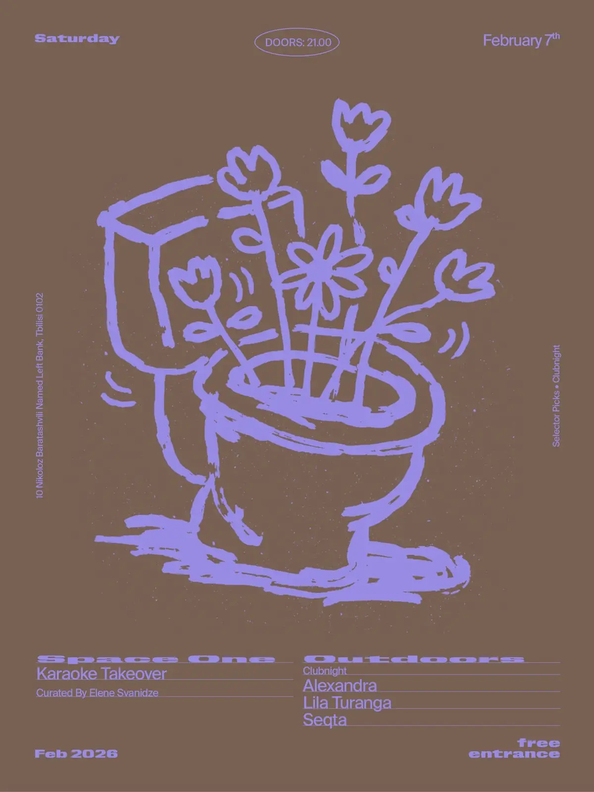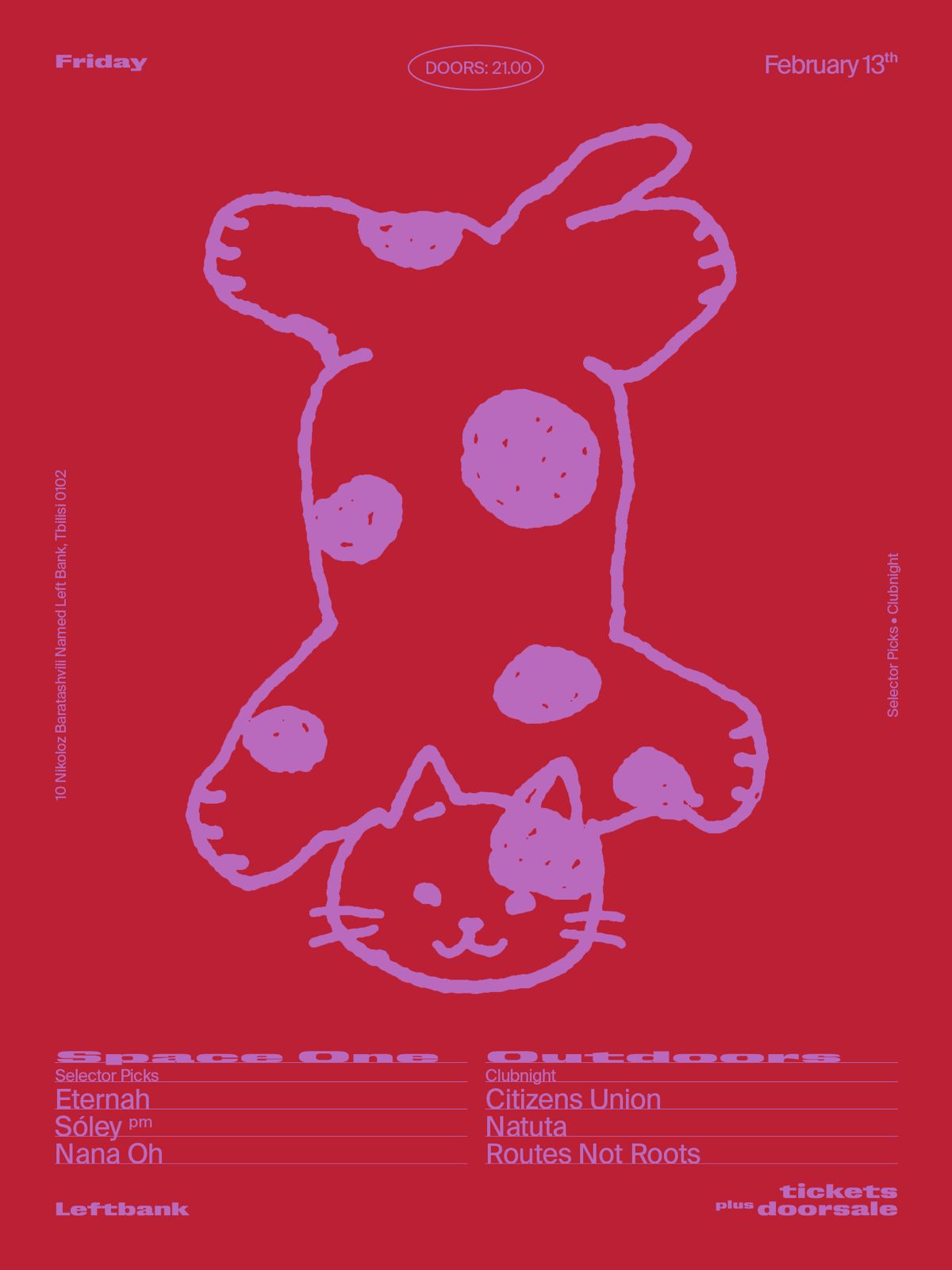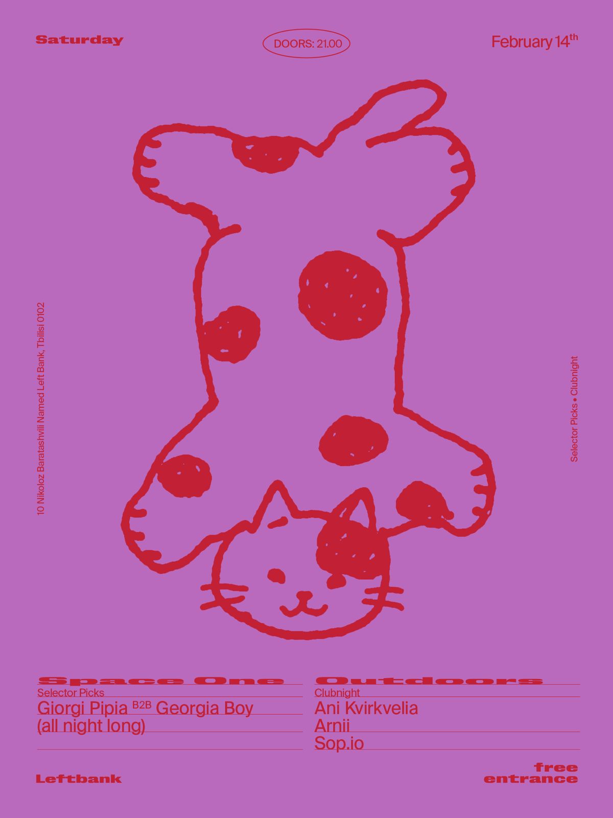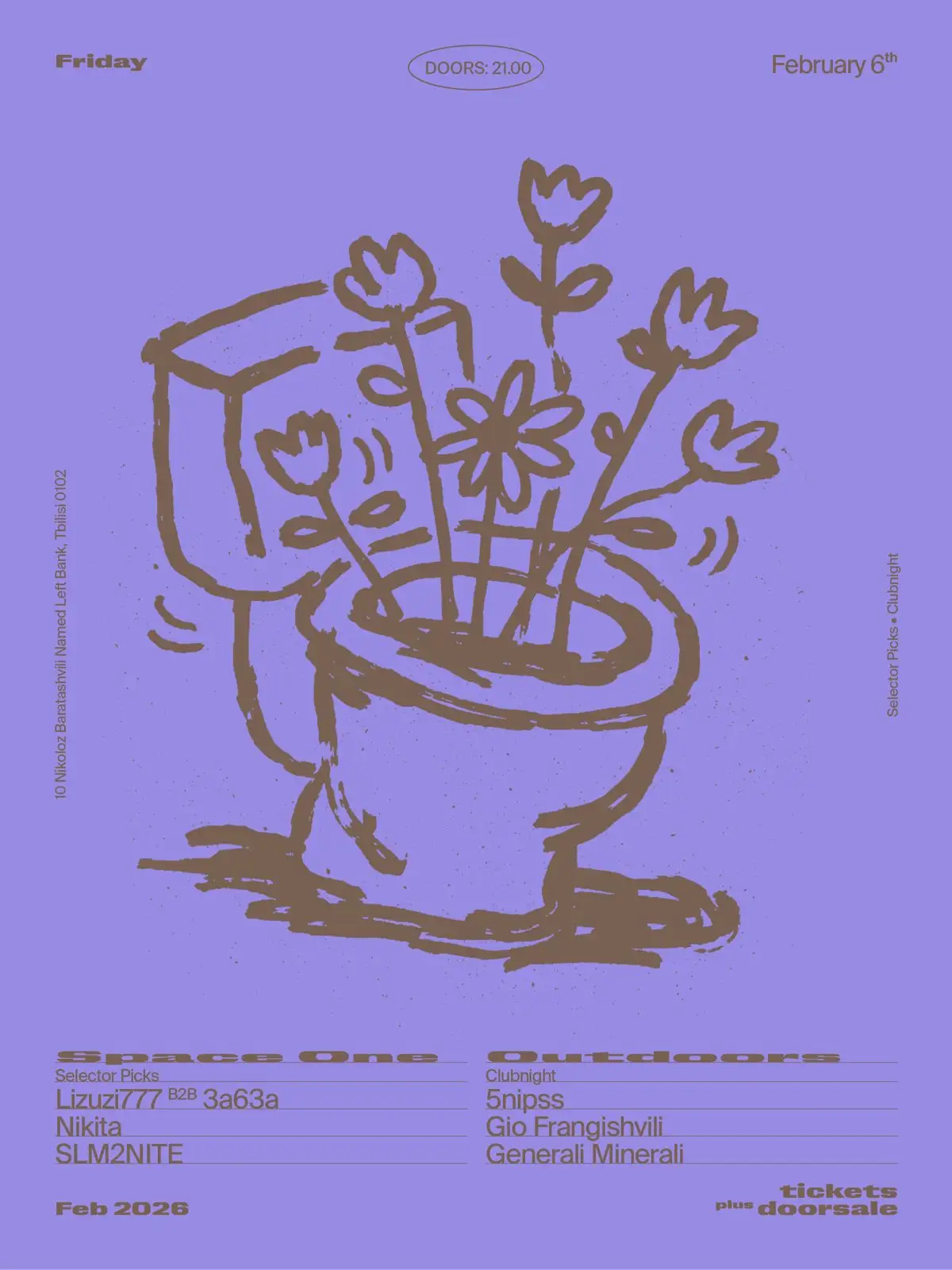 ✦ Friday's Clubnight at Left Bank on February 6 starts in Space One. From midnight, Outdoors features Gio Frangishvili, who runs TSA music platform. Generali Minerali brings production experience from TES Club residency. Left Bank resident 5nipss follows with house, Detroit grit, and bass-driven textures.