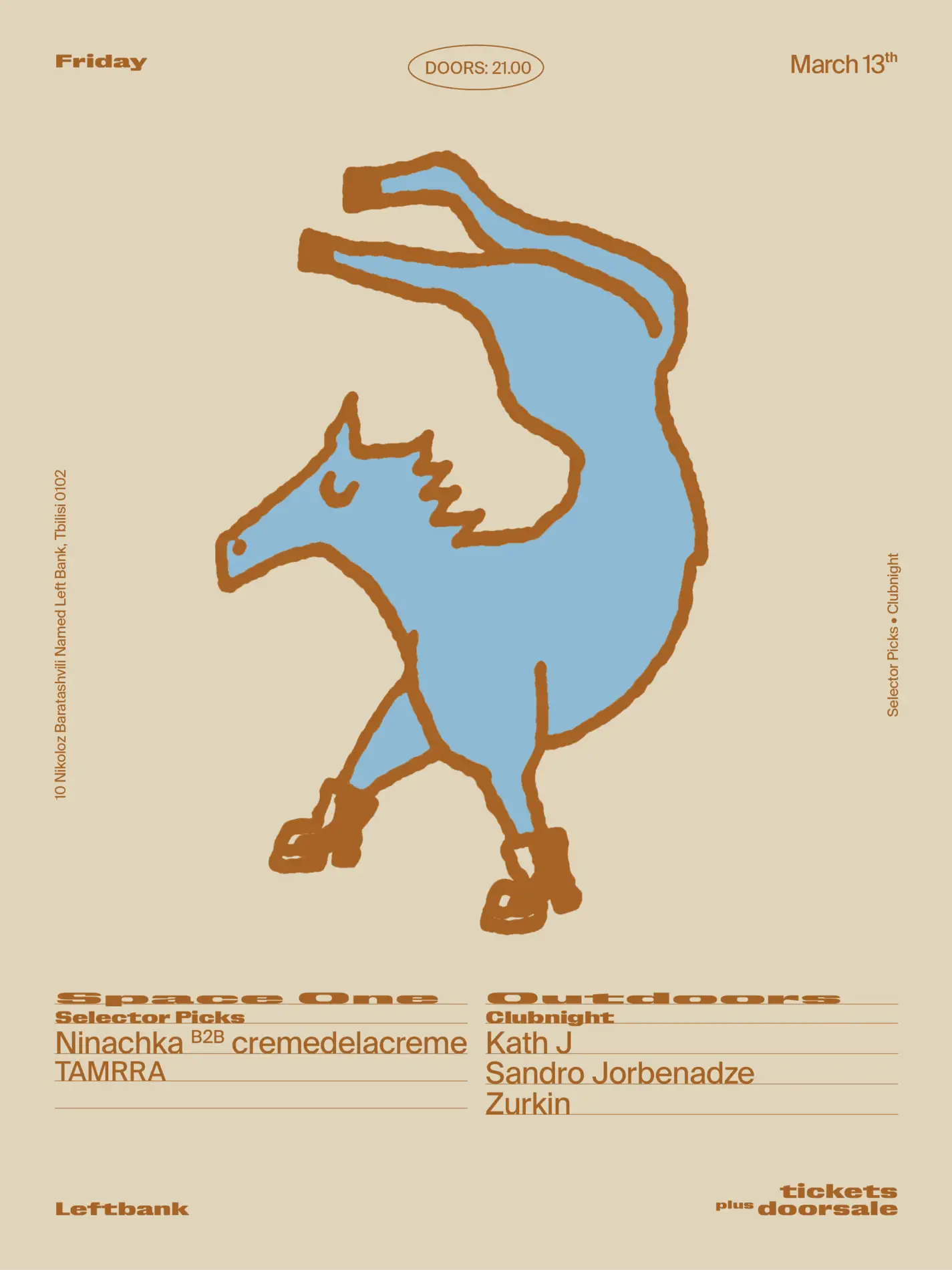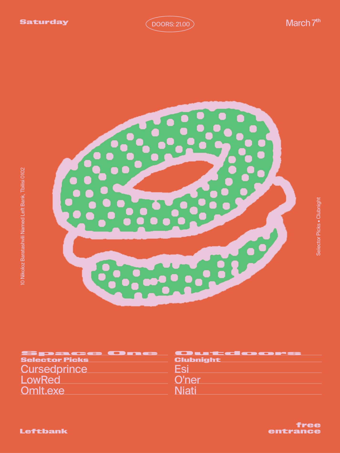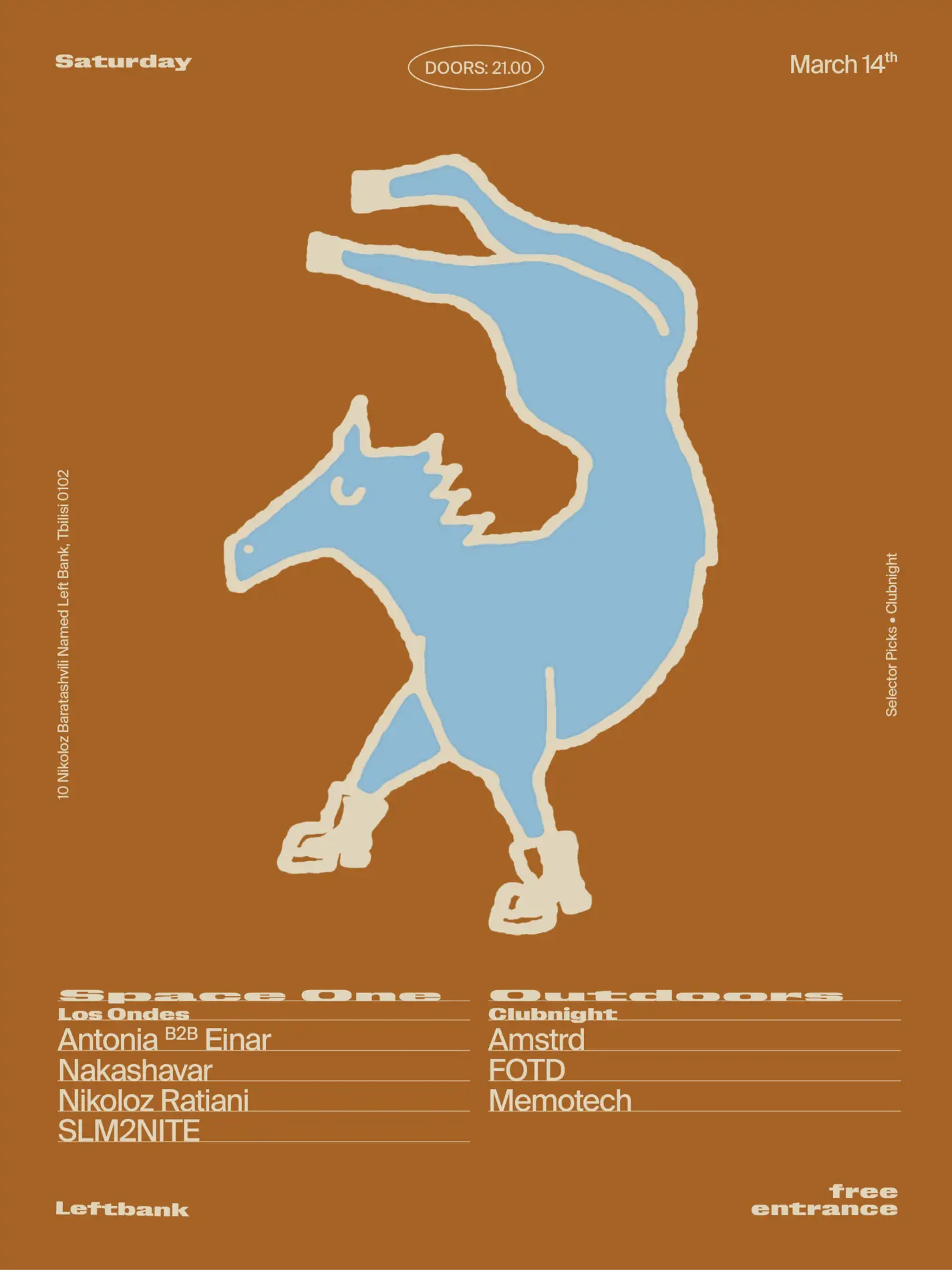✦ Free Saturdays at Left Bank continues on March 7, with Space One opening early before midnight shifts focus to Outdoors. Esi's work stretches from Berlin Atonal commissions to voltage-controlled experiments with V.C.V.S., collapsing the distance between gallery and club floor. Istanbul's O'ner adds tight, patient selections alongside Left Bank crew member Niati's direct floor sensibility.