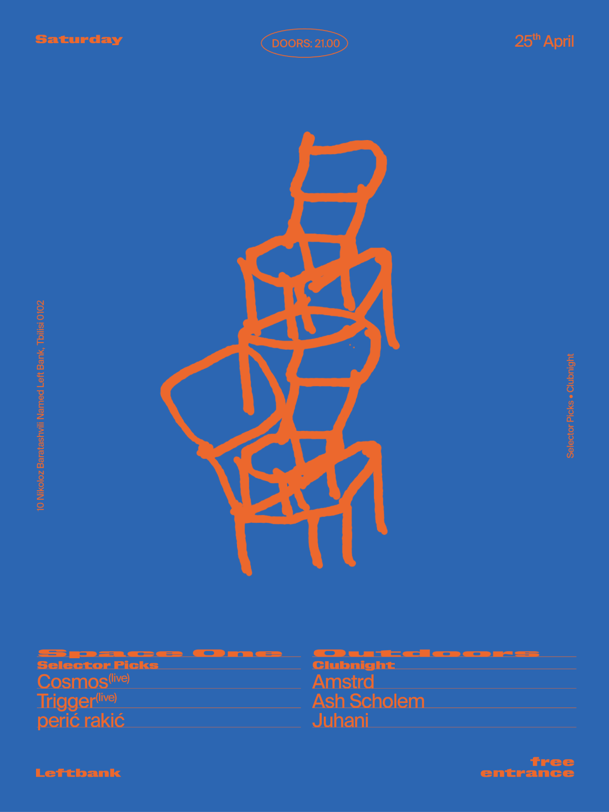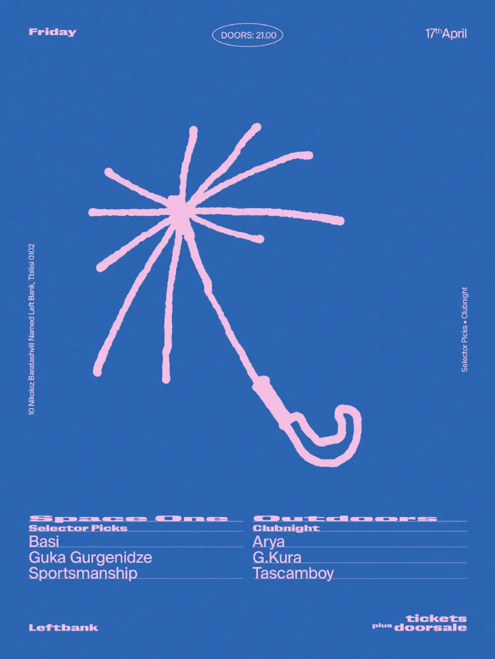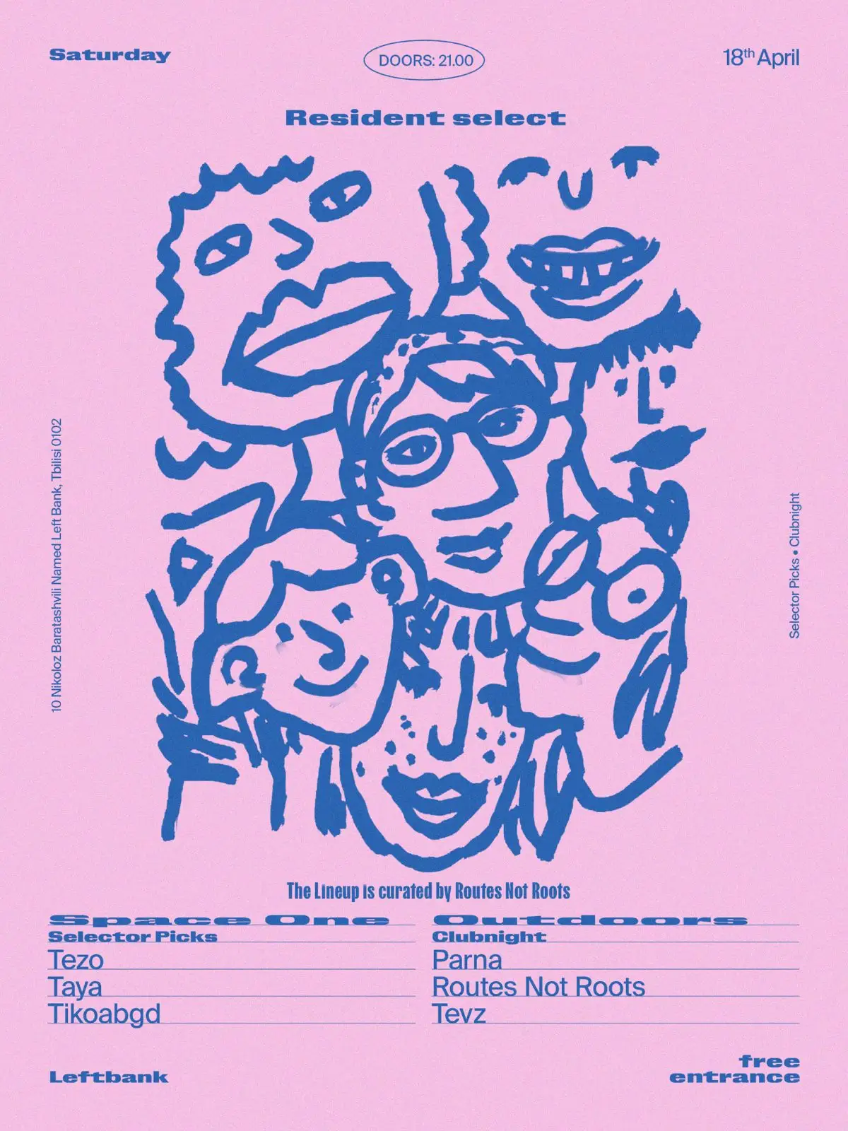 ✦ Free Saturdays at Left Bank on April 18 takes the form of a Resident Select, with Routes not Roots curating both stages from his closest music community. Outdoors features Parna, Tevz, and Routes not Roots. Space One presents Tezo, Taya, and Left Bank crew member Tikoabgd.