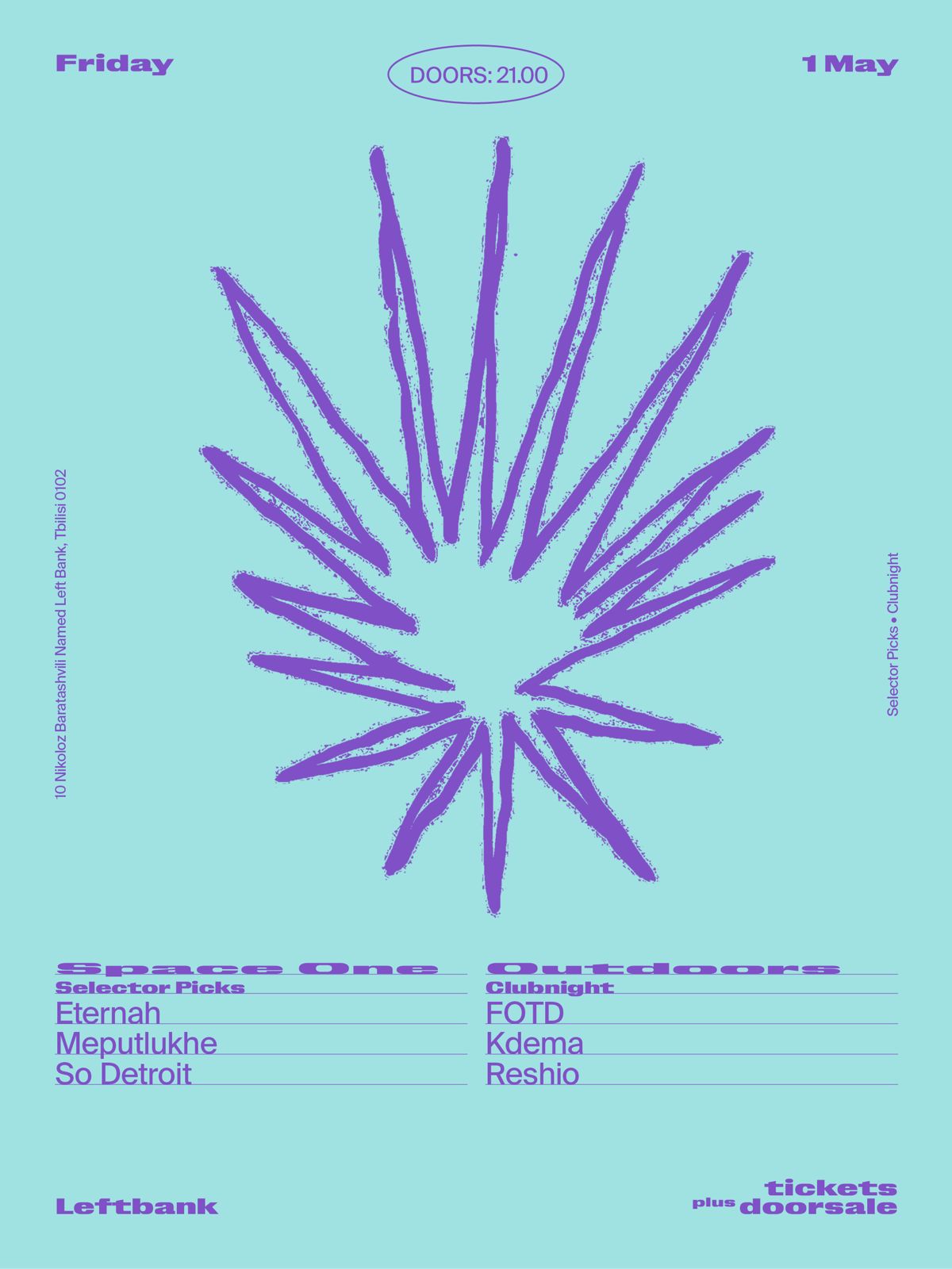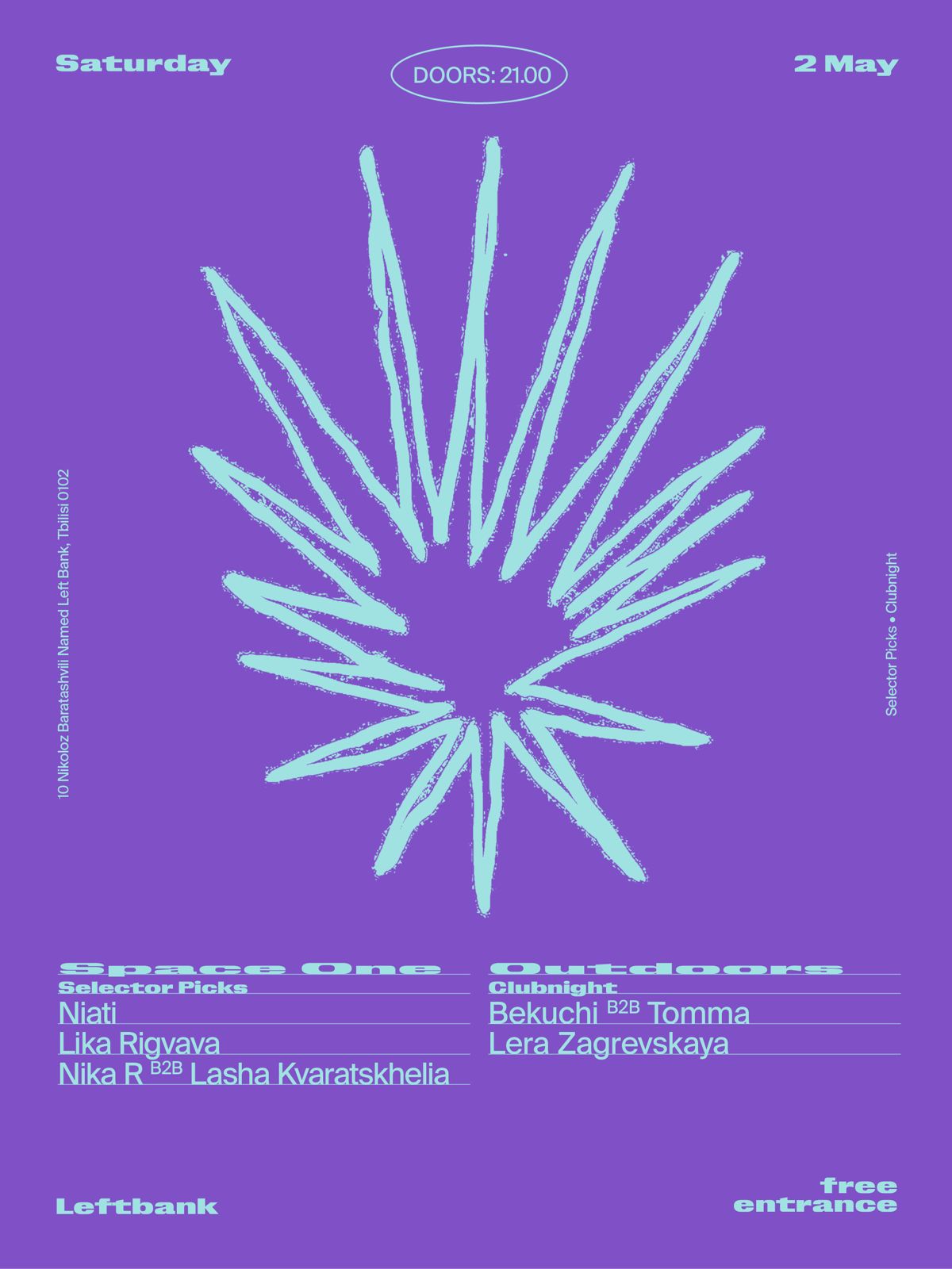 ✦ Free Saturdays at Left Bank on April 25 opens Space One with live performances from Trigger and Cosmos and a selector session. From midnight, Outdoors features Northern Finland's Juhani Oivo, who runs Elektorni label from Oulu, Amstrd from Batumi's Clime community, and Left Bank crew member Ash Scholem.