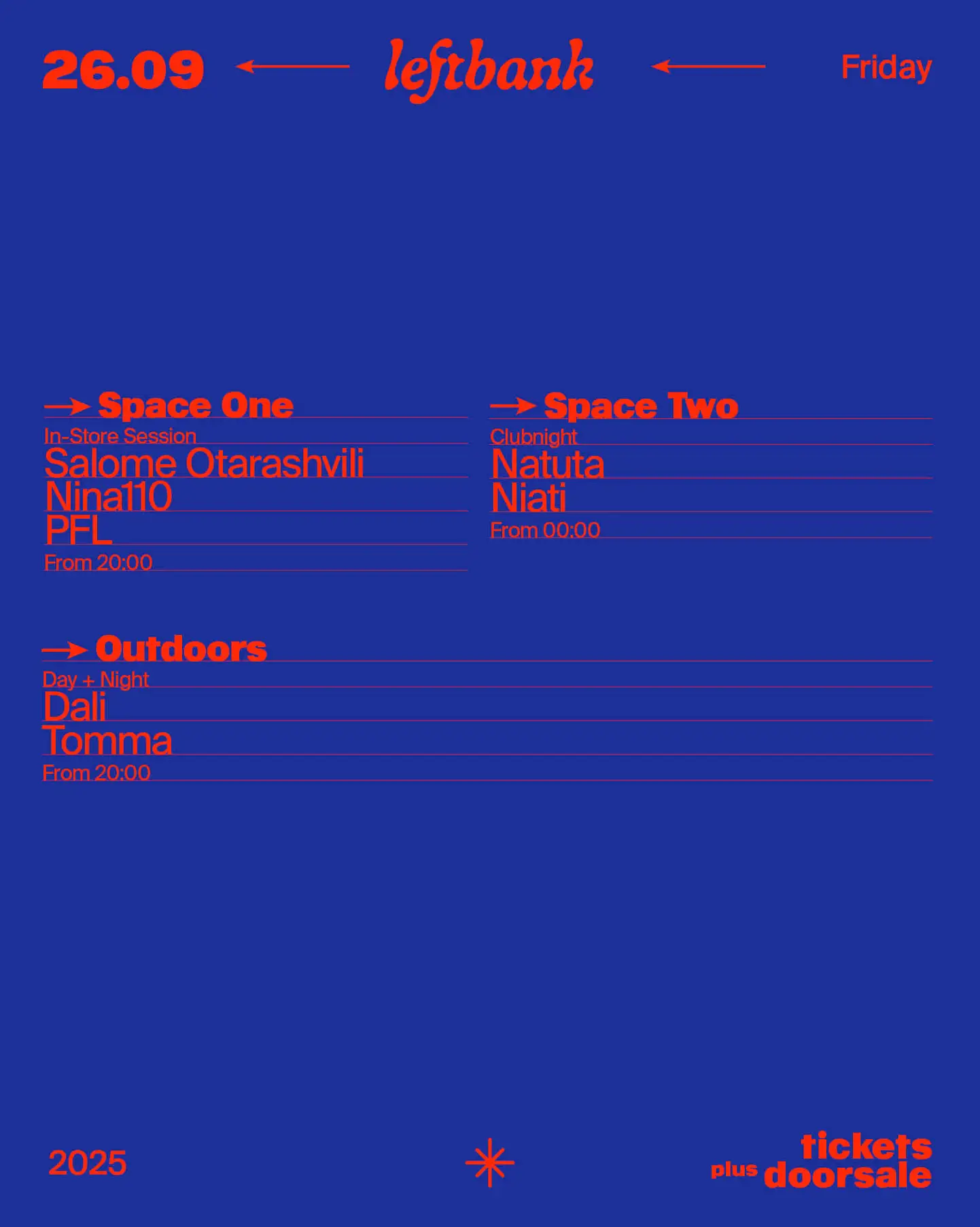 Friday’s Clubnight at Left Bank on September 26 begins in Space One, where selectors shape the early hours before the midnight move to Space Two. Outdoors starts ahead of Clubnight with Dali, a Tbilisi DJ and producer known for exploratory selections and releases on Fantastic Planet and Florence’s De Rio, plus shows on Mutant Radio, 20ft Radio, and Netil Radio. Tomma brings nearly two decades of reading and steering dancefloors. After midnight, Space Two hosts Natuta, who splits time between LA and Tbilisi and carries Eau de Cologne’s ethos into groove-led sets, alongside Niati, a fresh voice from the Left Bank team with a direct, club-focused approach.=