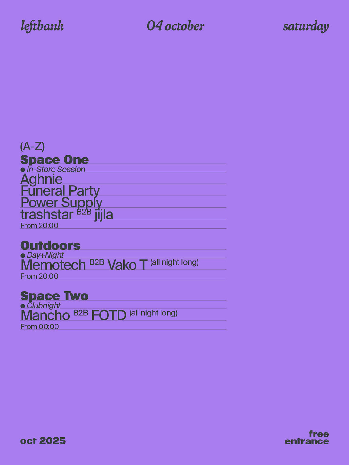 Free Saturdays at Left Bank on October 4 begins in Space One, where diverse selectors shape the opening mood before the focus shifts toward two all-night back-to-back sessions across Outdoors and Space Two. Outdoors features Memotech, the Batumi-born selector and .clime resident whose sets span trance, progressive, breakbeat, and electro, alongside Vako T, recognized for steering collaborative projects within the local scene. At the same time, Space Two hosts Mancho and FOTD, with Mancho’s sharp selections and taste for uncovering new directions meeting FOTD’s style closely tied to the spirit of Left Bank, creating a consistent exchange through the night.