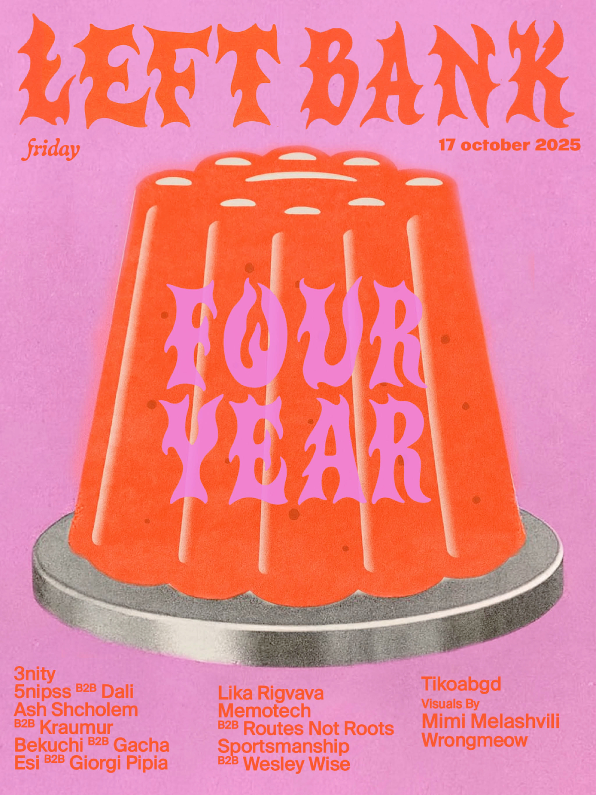 Friday, October 17, marks four years of Left Bank, a milestone celebrated with residents, crew members, and invited guests performing across all stages throughout the night. Space One opens with Esi and Giorgi Pipia sharing a back-to-back that mirrors their connection as residents, followed by crew members Tikoabgd, Lika Rigvava, and 3nity shaping the build-up before the transition to Outdoors and Space Two. Outdoors begins early with Ash Scholem and Kraumur setting an intuitive flow, followed by Memotech and Routes Not Roots whose shared residency shapes deep, evolving energy. Bekuchi joins Gacha, blending experience and technical precision in a set grounded in their long-standing collaboration. Inside Space Two, Wesley Wise and Sportsmanship extend the momentum with their layered selections, while Dali and 5nipss steer the celebration toward its finale through forward-thinking exchanges between sound and emotion.