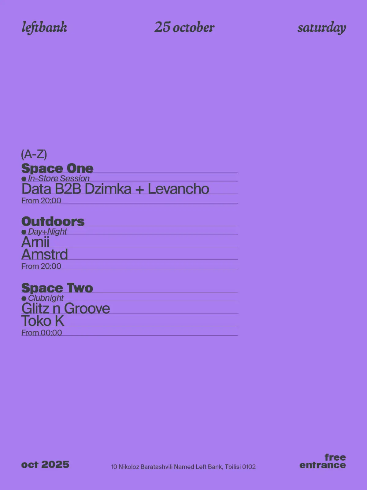 Free Saturdays at Left Bank on October 25 begins in Space One with selectors shaping the evening’s opening flow. Outdoors starts ahead of Clubnight with Arnii, a Georgia-born curator and DJ based in Prague whose sets move through UK-inspired techno, bass, and experimental club sounds. Amstrd joins from Batumi’s Clime community, bringing precision and depth shaped by years of local engagement. After midnight, Space Two hosts Glitz N' Groove, a Tbilisi-based project focused on house and trance-driven energy that adapts to each room, alongside Toko K, a member of the Mtkvarze crew recognized for sharp mixing and a broad musical perspective.