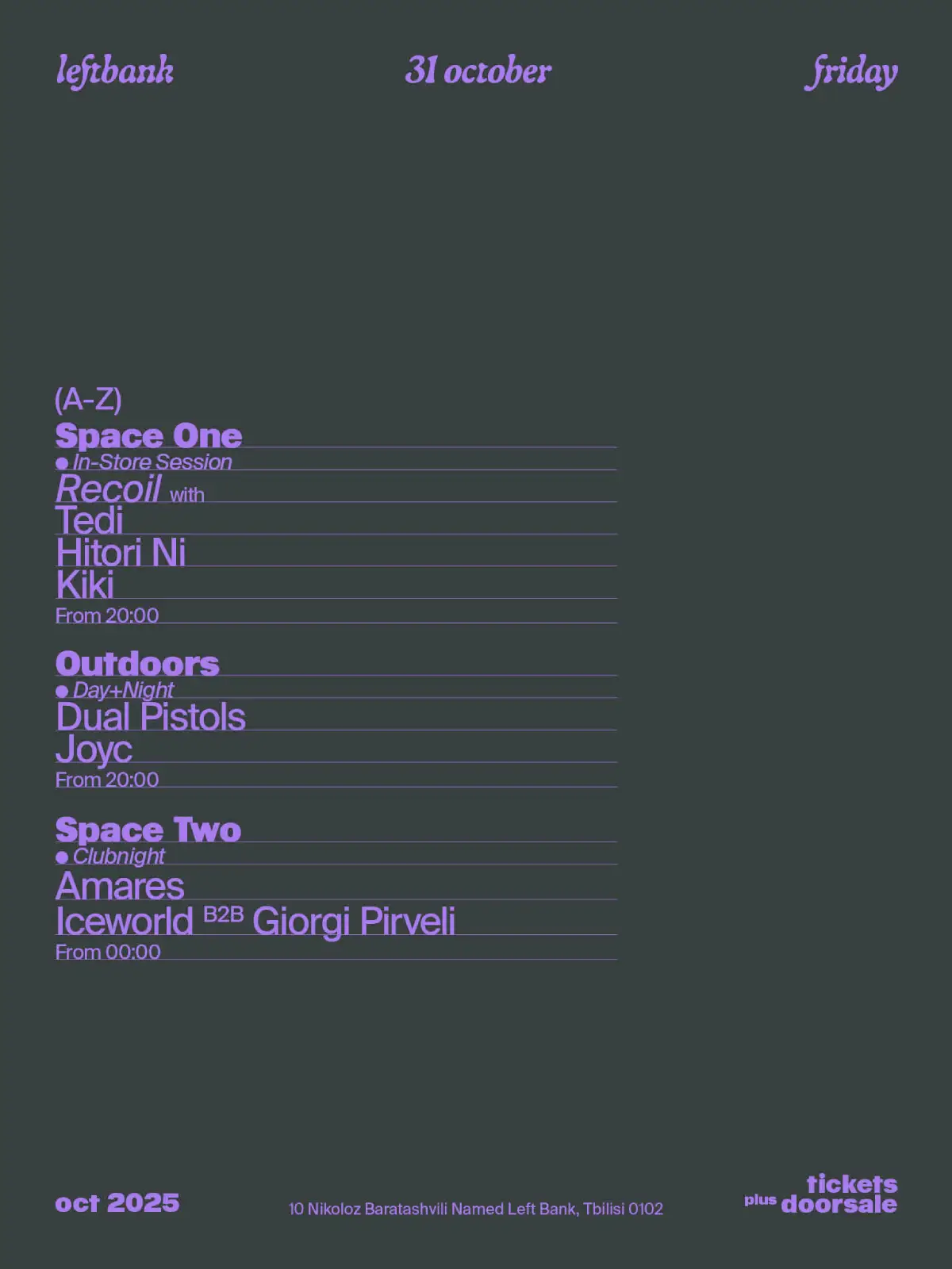 Friday’s Clubnight at Left Bank on October 31 starts with a Pre-Party in Space One, where selectors guide the evening’s first phase before the midnight focus on Space Two. Outdoors opens earlier with Joyc, a newcomer bringing sharp instinct and a developing sound, followed by Dual Pistols from KHIDI, whose style combines hypnotic flow with heavier industrial structure shaped by cross-cultural experience. After midnight, Space Two hosts Iceworld and Giorgi Pirveli in a back-to-back set marked by contrast and balance. Amares follows, directing the closing hours through techno infused with trance depth and rhythmic movement.