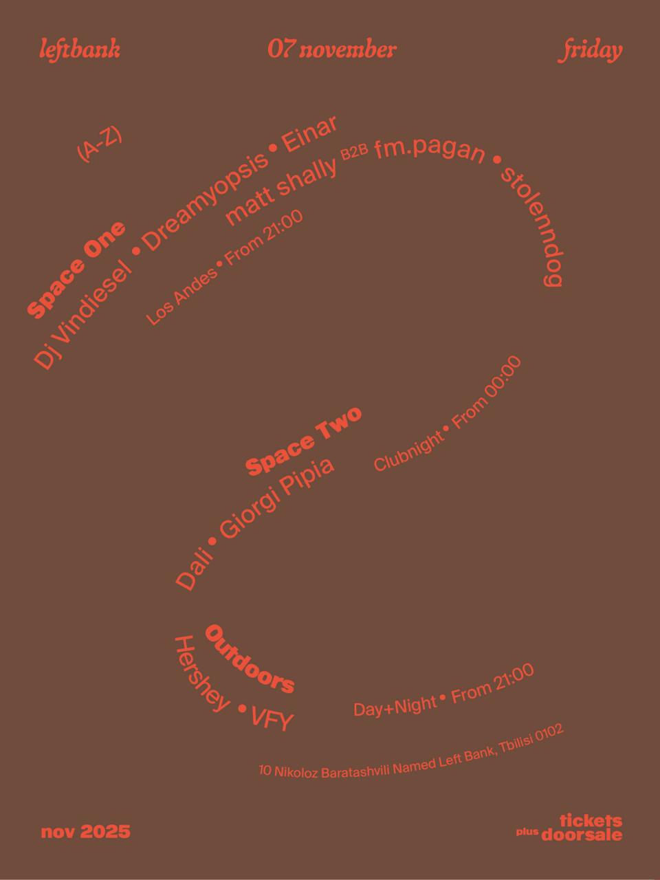 Friday, November 7, at Left Bank opens with Space One hosting Los Andes, a Tbilisi platform for contemporary Latina electronic music. Outdoors brings Dali, a Tbilisi DJ and producer with releases on Fantastic Planet and De Rio, paired with HerShe, a queer multidisciplinary artist active in the local scene. Inside Space Two, VFY, known as Tobako Tween, draws on years of vinyl digging to shape detailed selections, while resident Giorgi Pipia channels broad cultural threads informed by his club work and Rinse FM radio show. The program remains non-linear across spaces, maintaining momentum without a fixed arc.