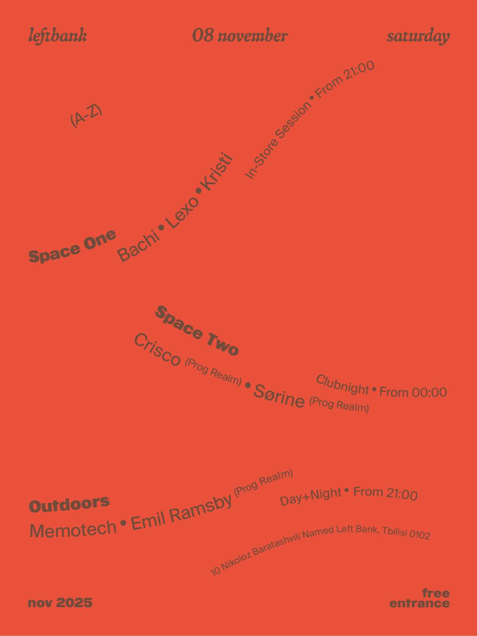 Free Saturdays at Left Bank lands on November 8 with selectors shaping Space One’s early build while attention spreads across the club. Outdoors starts ahead of Clubnight with Memotech, a Left Bank resident tied to Batumi’s .clime circle and Trigger, moving through trance, progressive, breakbeat, and electro alongside Copenhagen DJ Emil Ramsby. After midnight, Space Two hosts a Prog Realm showcase from Copenhagen with Sørine and Crisco, emphasizing long-form structure, patient tension, and deep rhythm studies developed through residencies at Jolene Bar and Gehør in Oslo. The program keeps separate arcs between stages, favoring steady pulse and detailed phrasing over big-room dramatics.