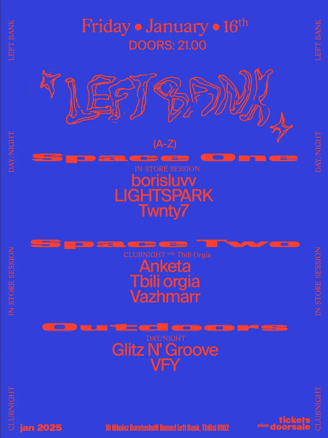 ✦ Friday's Clubnight at Left Bank on January 16 begins in Space One, where selectors shape the Pre-Party before the transition to Space Two at midnight. Outdoors opens earlier with VFY, known as Tobako Tween, bringing years of vinyl-digging experience to detailed selections, paired with Glitz N' Groove, a Tbilisi project centered on house and trance that responds to the room's energy. Space Two welcomes the Tbili Orgia crew, featuring Anketa, Vazhmarr, and Tbili Orgia, delivering genre-defying sets that combine obscure finds with their signature eclectic approach.