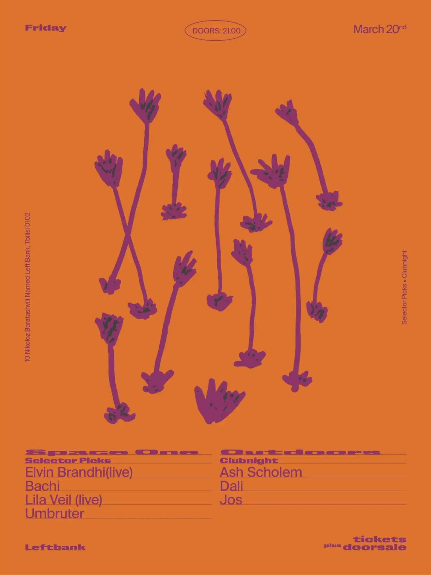 Friday's Clubnight at Left Bank on March 20 opens with Space One earlier than Outdoors, where two local selectors share the room with distinct live performances from Elvin Brandhi, a Welsh improviser whose auto-tune blast beats erupt from field recordings and caustic streams of consciousness, and Lila Veil, whose vocal work carries traces of a childhood spent in rural Georgian mountains into something softer and more melancholic.