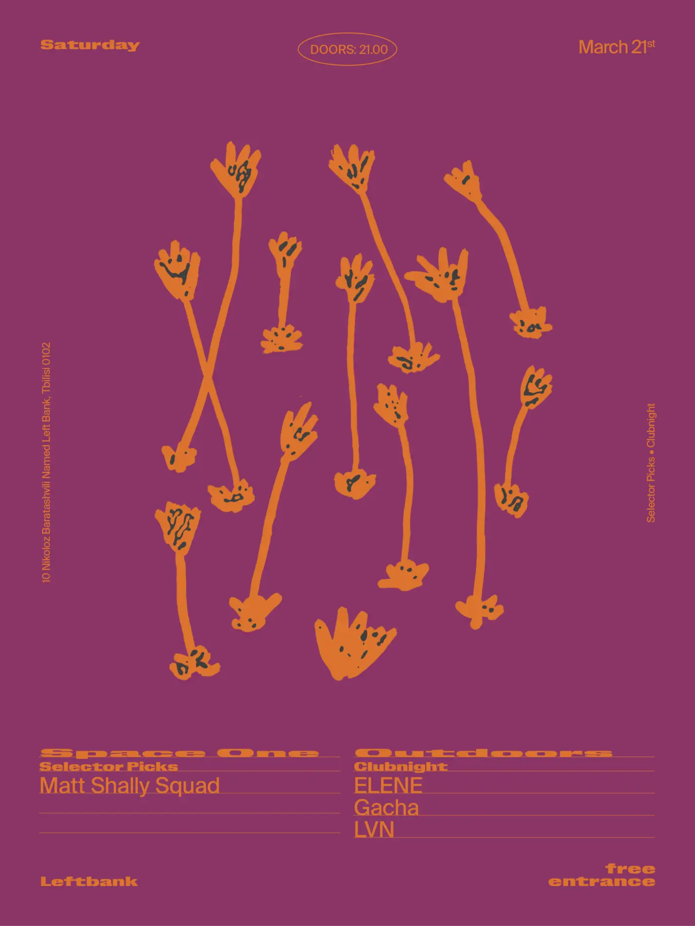 Free Saturdays at Left Bank continues on March 21, with Space One opening ahead of Outdoors as selectors guide the early hours before midnight shifts the focus. Gacha Bakradze, the venue's co-founder, carries a production catalog that runs through Lapsus, Apollo, and Cin Cin, releases that earned recognition from Pitchfork and Resident Advisor. That label-level perspective shapes how he approaches the booth, each selection filtered through a producer's understanding of arrangement and tension. LVN, a Left Bank crew member and longtime presence behind the decks, threads house and trance elements into sets that draw on years of reading rooms across different circuits. ELENE adds a newer voice to the lineup, her selections moving between melodic and rhythmic registers with a range that signals developing taste.